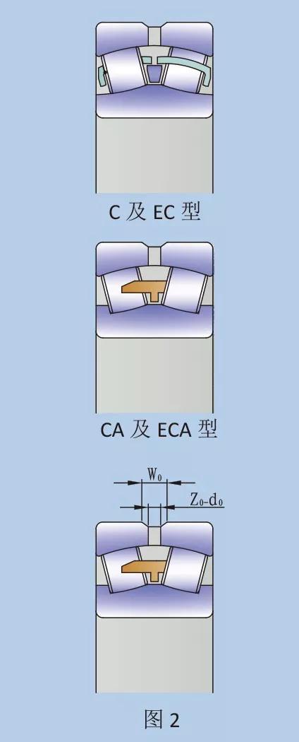 此類軸承具有對稱滾子,內(nèi)圈有擋邊。導(dǎo)圈在兩列滾子中間,從內(nèi)圈定心。保持架為一體式黃銅或鋼制機削架。CA 及 ECA 型采用 C 型式的表面加工,ECA 型帶有加強滾子,從而提高承載能力。